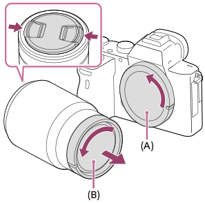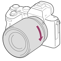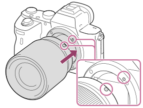 - Objektiv an Kamera anbringen: Weiße Ausrichtmarkierungen aufeinander ausrichten und Objektiv nach rechts drehen